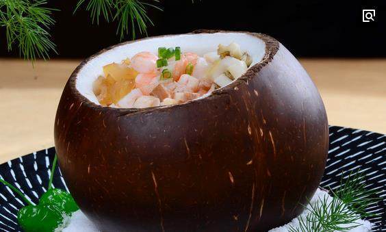椰子飯 當(dāng)細(xì)糯的米香遇上清淡的椰子,就誕生了椰子飯,光是聽到名字就覺得香甜可口。在海口,食用此種以椰子肉為底的船形小食品,是當(dāng)?shù)厝嗣衿砬笮腋5南笳鳎彩茄缯?qǐng)貴賓和親朋好友的上等佳品。所以到海口的游客都會(huì)嘗嘗這味道和寓意都極好又極具特色的椰子飯