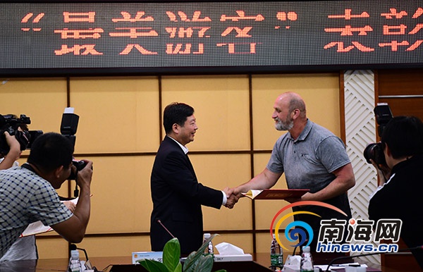 三亞市委常委、常務副市長陳鐵軍(左)為帕斯卡尼·尤拉(右)頒發榮譽證書。南海網記者 沙曉峰攝