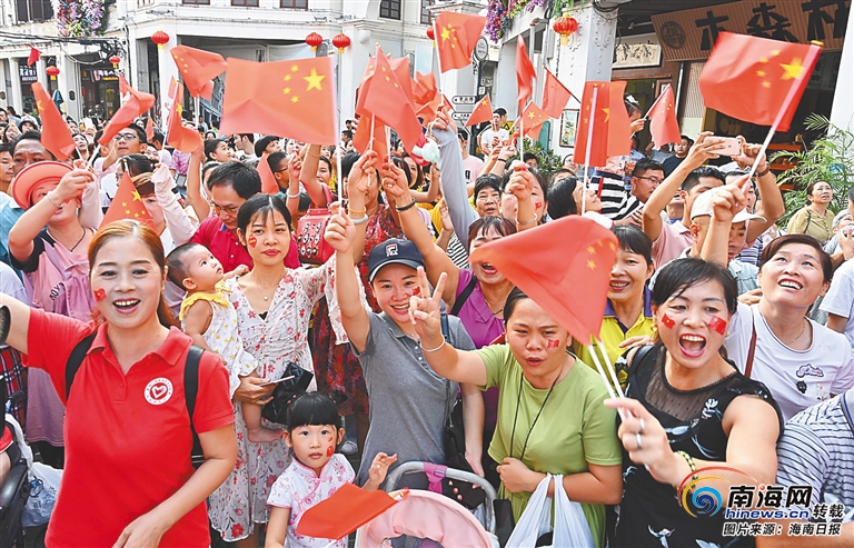 10月1日,海口騎樓老街上國(guó)旗飄揚(yáng),游客和市民用歌聲祝福祖國(guó)繁榮昌盛。海南日?qǐng)?bào)記者 王凱 攝