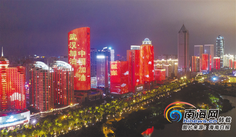 新冠肺炎疫情牽動(dòng)著每一位中國(guó)人的心。2月8日,正值元宵佳節(jié),海口、三亞一些街道的樓體上亮起主題燈光,為武漢加油,為中國(guó)加油!圖為2月8日晚,海口市濱海大道點(diǎn)亮主題燈光。海報(bào)集團(tuán)全媒體中心記者 陳若龍 攝