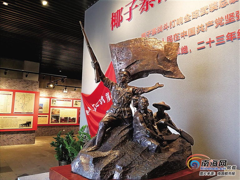 在紀(jì)念館廣場(chǎng)上,由一面旗幟和一桿長(zhǎng)槍組合造型、總高度為9.23米的主題雕塑矗立著。“旗幟寓意椰子寨戰(zhàn)斗豎起的瓊崖革命武裝斗爭(zhēng)紅旗23年不倒,槍桿子寓意全瓊崖武裝總暴動(dòng)從椰子寨戰(zhàn)斗開始打響,雕塑的高度寓意著在1927年的9月23日,打響了瓊崖武裝革命第一槍。”才源介紹說(shuō),椰子寨戰(zhàn)斗主題雕塑是海南省瓊臺(tái)畫院院長(zhǎng)劉培寧設(shè)計(jì)的。椰子寨戰(zhàn)斗遺址于2018年被省委宣傳部正式命名為省級(jí)愛國(guó)主義教育基地。瓊海市委宣傳部指導(dǎo)協(xié)調(diào)海南省軟件學(xué)院,在椰子寨紅色書屋旁設(shè)立了海南軟件學(xué)院學(xué)生創(chuàng)業(yè)孵化基地,基地內(nèi)設(shè)有手工藝術(shù)及紙牌咖啡兩個(gè)創(chuàng)業(yè)項(xiàng)目。