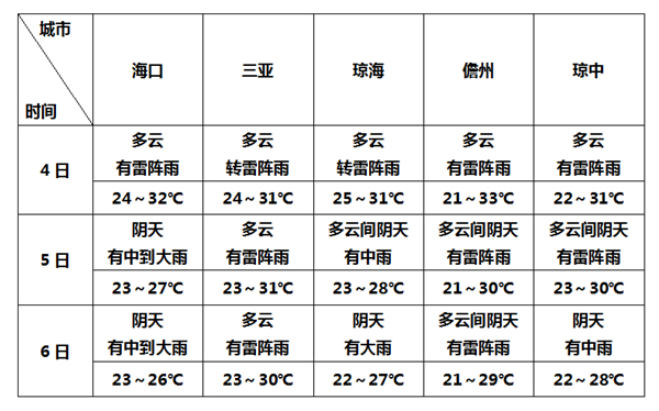 預計4日夜間~6日,受弱冷空氣影響,海南島大部分地區(qū)有陣雨或雷陣雨,局地暴雨,其中五指山以北局部地區(qū)伴有雷雨大風和短時強降水等強對流天氣;各地氣溫下降,6日全島最高氣溫26~29℃,最低氣溫20~23℃。