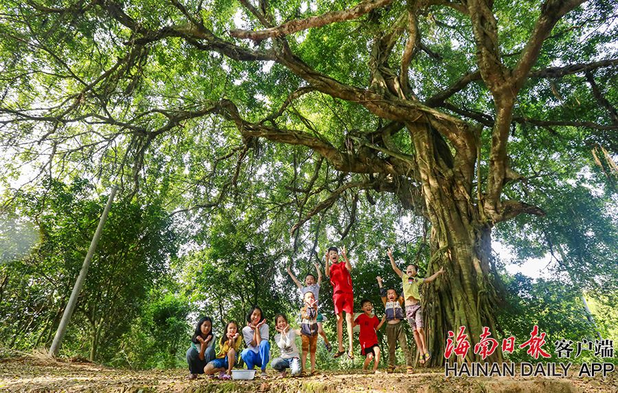 4月11日,在儋州市大成鎮小嶺村委會新坊村,一株300多年的垂葉榕下,孩子們在玩耍。