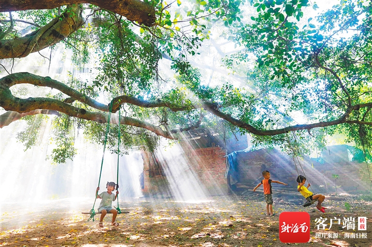 俗話說:“大樹底下好乘涼。”海南炎熱的夏天,驕陽似火,悶熱難耐,在儋州市廣大農村,村民們喜歡在大樹古樹下納涼避暑,成了鄉村夏日的一道風景。圖為5月18日,儋州中和鎮水井村,幾名小孩在大樹下蕩秋千。 海南日報記者 陳元才 攝