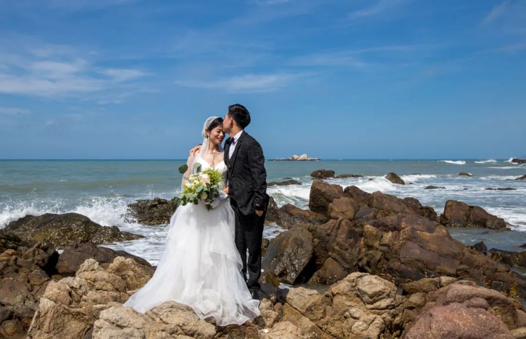 新人在三亞天涯海角游覽區婚拍基地拍攝婚紗照。海南日報記者 武威 攝