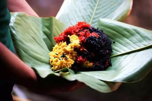三色棕由黑、紅、黃三色組成,是海南黎苗族特色美食之一,采用黃姜、雞屎藤、紅藍藤葉無公害天然染色,配上當地特色的山蘭稻米與黑豬肉制作而成。初出熱鍋的三色粽,香味四溢。