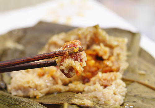 值得一提的是,相比以上兩種粽子,儋州洛基粽除了由豬肥肉、瘦肉、五花肉、雞肉、咸鴨蛋等材料制成外,還加入了魷魚絲。