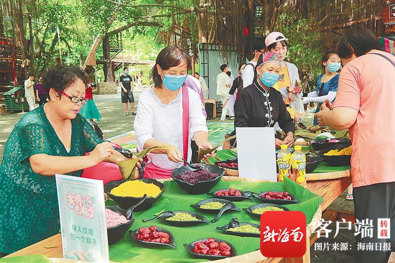 6月25日,海南檳榔谷黎苗文化旅游區舉辦多樣活動,包括端午祈福快閃、包黎家三色粽子、擲色子趣味游戲等。通訊員 潘達強 攝