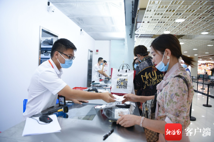 7月10日,三亞鳳凰國際機場新增的免稅提貨點啟用,旅客在辦理提貨業務。記者沙曉峰攝
