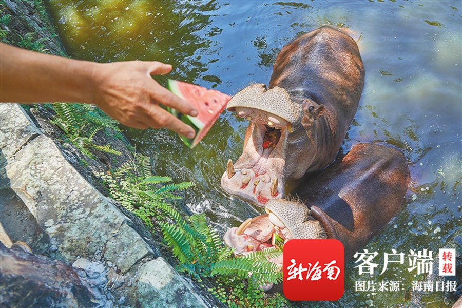 飼養(yǎng)員給河馬投喂西瓜降暑。
