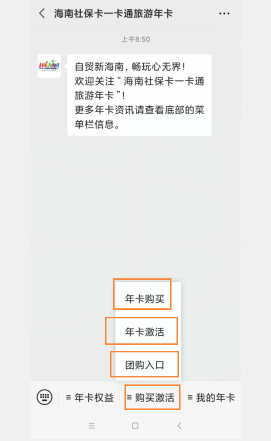 微信關注官方公眾號“海南社保卡一卡通旅游年卡”,通過下方入口進行操作購買,并于8月1日起激活旅游年卡,即可使用。