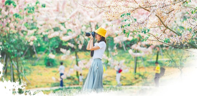 儋州蘭洋鎮櫻花綻放,吸引不少游客前來“打卡”。海報集團全媒體中心記者 陳若龍 攝