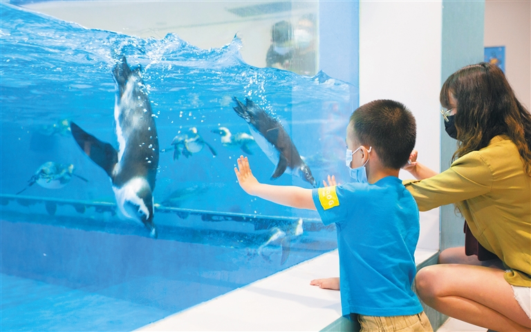 游客帶著孩子在大白鯨·三亞海洋探索世界近距離觀賞企鵝。海南日報記者 武威 攝