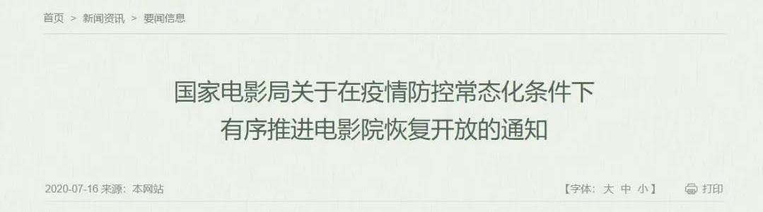 7月16日,國家電影局發布關于在疫情防控常態化條件下有序推進電影院恢復開放的通知。