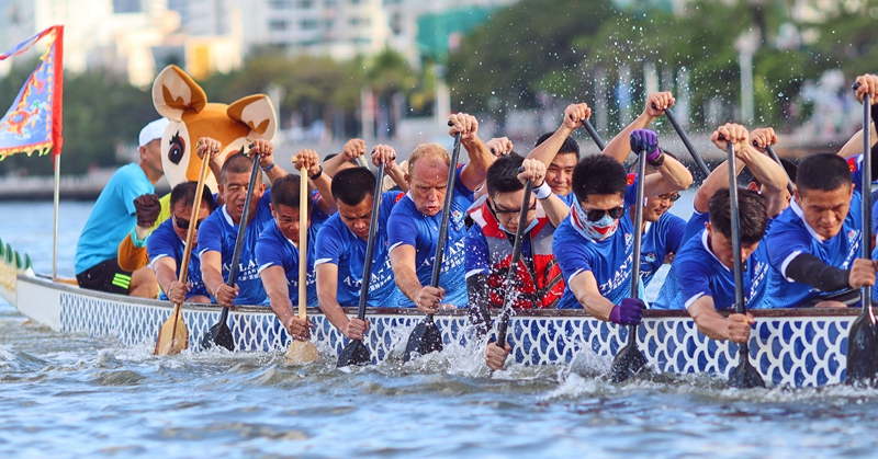 由職工組成的亞特蘭蒂斯業余龍舟隊在三亞河畔中進行訓練。