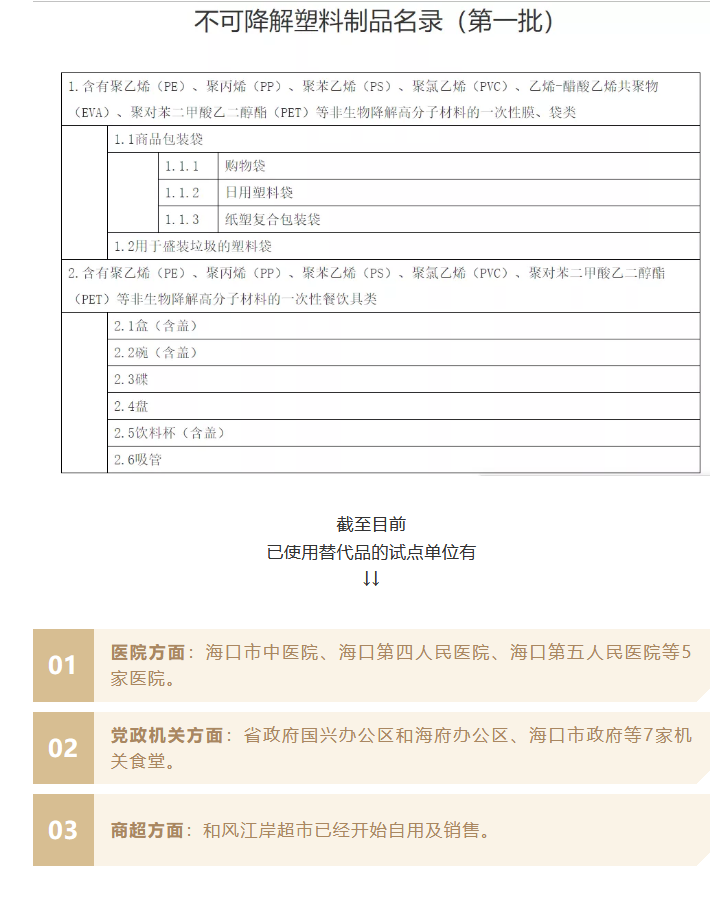 根據(jù)禁塑工作要求,上述試點(diǎn)行業(yè)要對(duì)被列入《海南省禁止生產(chǎn)銷(xiāo)售使用一次性不可降解塑料制品名錄(第一批)》的塑料膜袋、餐具等2大類(lèi)8小類(lèi)一次性不可降解塑料制品說(shuō)“不”,以負(fù)面清單的形式拒絕“白色污染”。