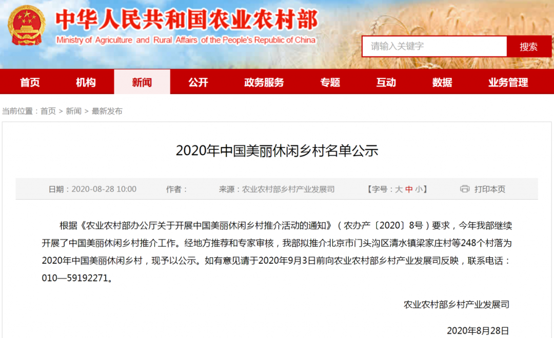 根據《農業農村部辦公廳關于開展中國美麗休閑鄉村推介活動的通知》(農辦產〔2020〕8號)要求,今年我部繼續開展了中國美麗休閑鄉村推介工作。經地方推薦和專家審核,我部擬推介北京市門頭溝區清水鎮梁家莊村等248個村落為2020年中國美麗休閑鄉村,現予以公示。如有意見請于2020年9月3日前向農業農村部鄉村產業發展司反映,聯系電話:010—59192271。