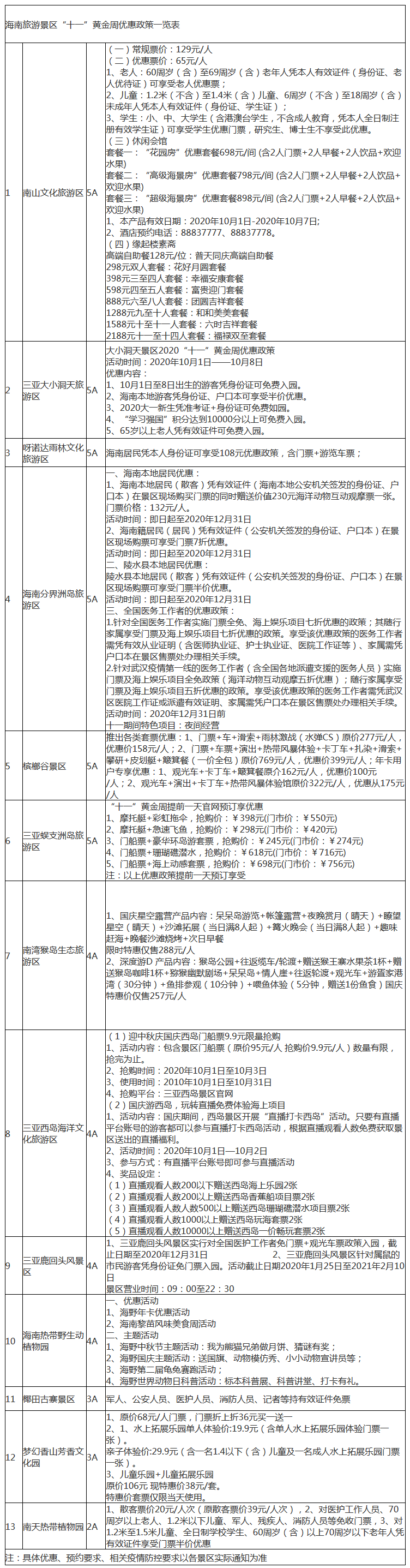 附:海南旅游景區“十一”黃金周優惠政策一覽表