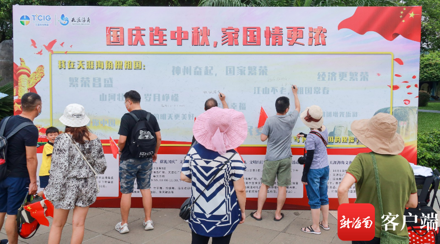 據介紹,為營造歡樂祥和、文明有序的節日氛圍,天涯海角游覽區共用了2.5萬多盆花卉、上千面國旗、多個特色造型將景區裝扮一新。在天涯海角星廣場,游客紛紛拿起筆寫下對祖國的祝福,表達對祖國的熱愛。景區工作人員也為他們免費送上了小國旗或國旗貼,在景區隨處可見手持國旗的游客,一抹抹鮮艷的“中國紅”, 成為景區流動的風景線, 濃濃的節日氣氛撲面而來。