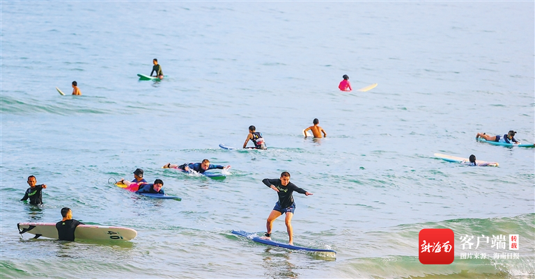 海南日報記者在日月灣看到,在海灣近處的沙灘上,不少像侯俊這樣新接觸沖浪的游客,都在教練的帶領下練習沖浪的基礎動作。不遠處的海面上,近百只色彩不一的沖浪板隨著海浪起伏,初學者抱著沖浪板在水中浮浮沉沉,時不時傳來一陣陣歡聲笑語。更遠一些的海面上,一只只沖浪板在海浪中忽進忽退地穿梭,沖浪客“騎”著沖浪板,或站立、或蹲伏,好似在浪尖起舞。