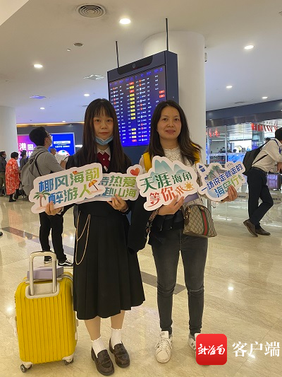 旅客購買“隨心飛”產(chǎn)品,搭乘飛機來瓊并合影。記者蘇靚攝