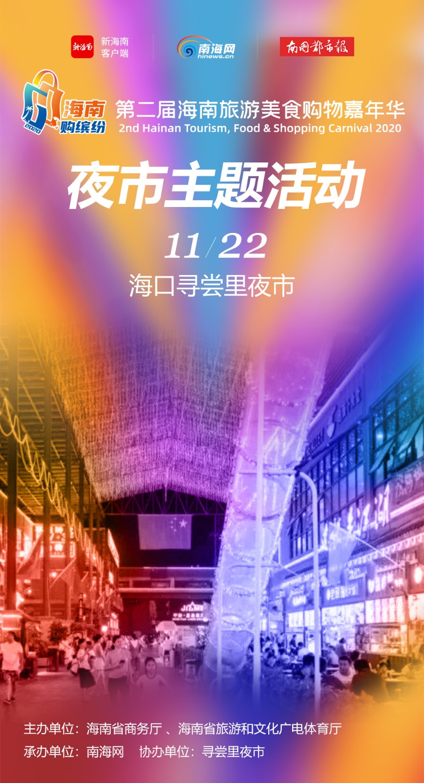 新海南客戶端、南海網、南國都市報11月22日消息(記者鐘圓圓)11月22日晚7時30分,由海南省商務廳、海南省旅游和文化廣電體育廳舉辦,南海網承辦,尋嘗里夜市協辦的2020第二屆海南旅游美食購物嘉年華夜市主題活動將在海口尋嘗里夜市火熱開場。