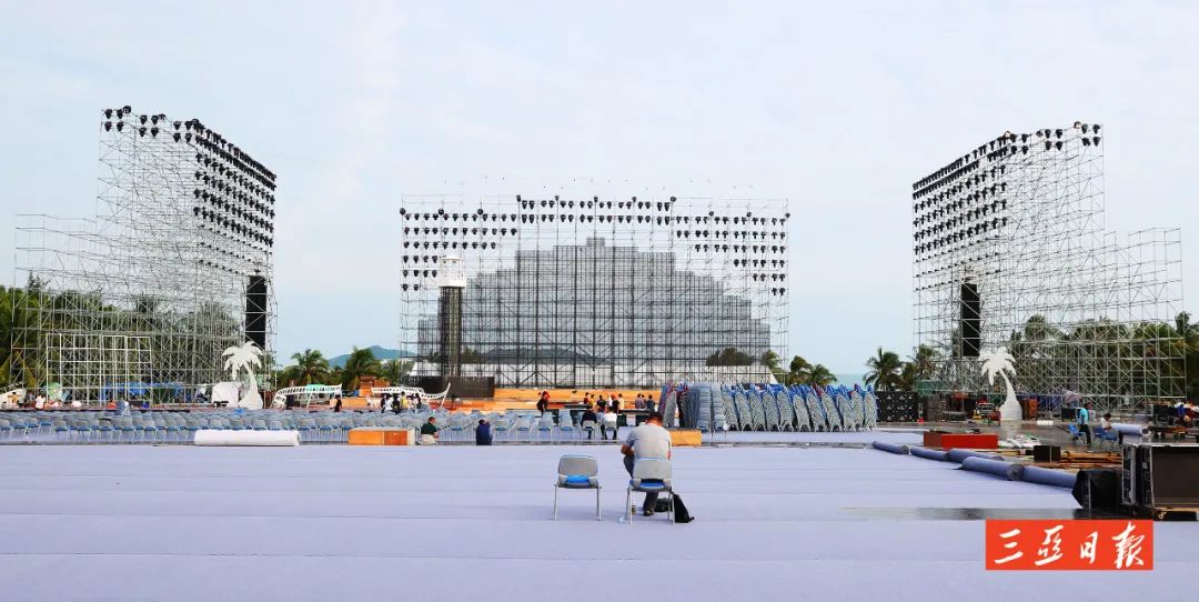 舞臺前擺放的椰樹、電影膠卷等裝飾品呈現著椰風海韻,“影”味十足。舞臺下紅色和藍色的座椅也被整齊排開,屆時現場可容納近3100人觀禮。