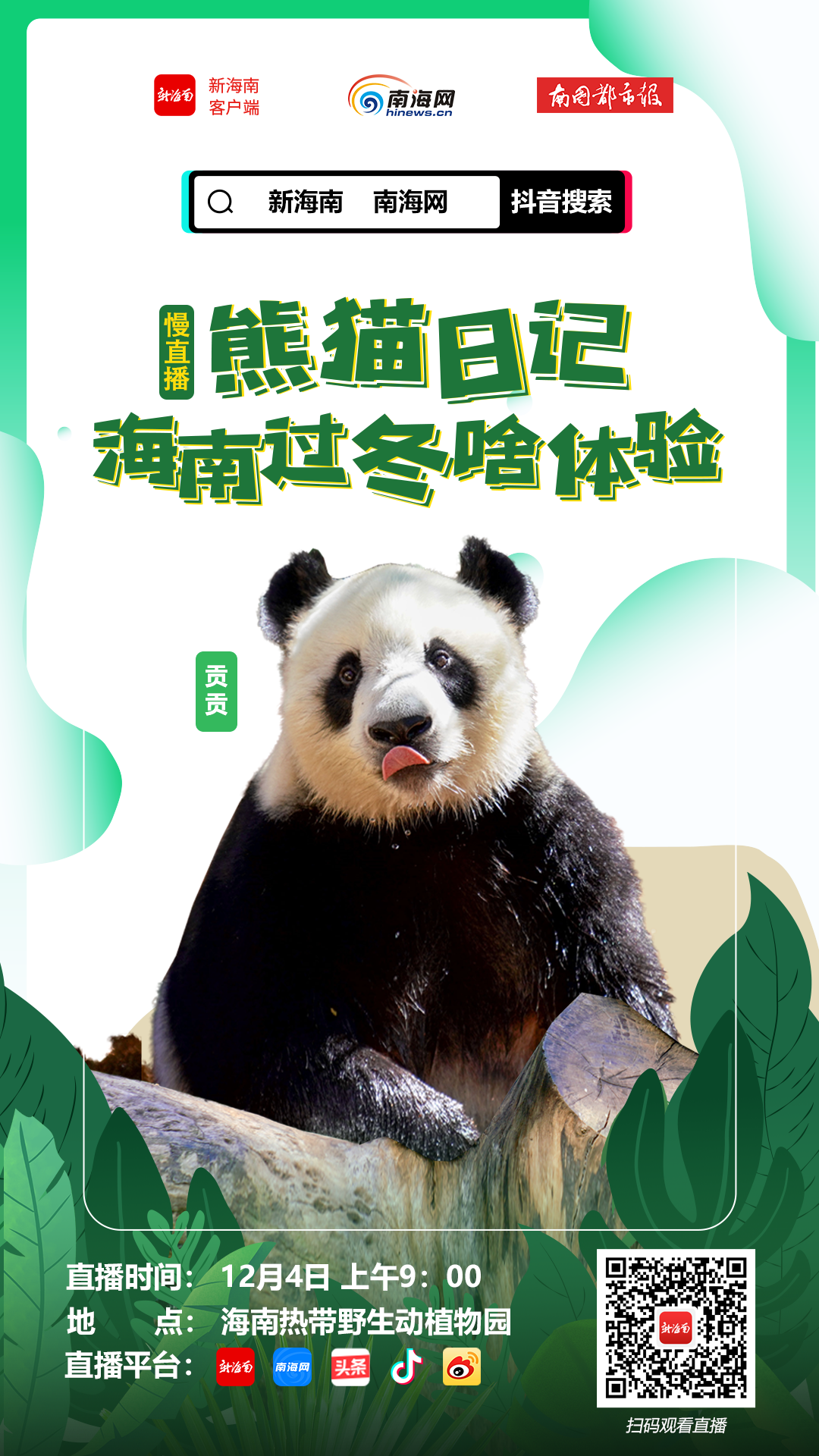 12月4日上午9點,歡迎關(guān)注新海南客戶端、南海網(wǎng)、今日頭條、抖音、微博直播間,參與直播,一起走進“熊貓世界”。