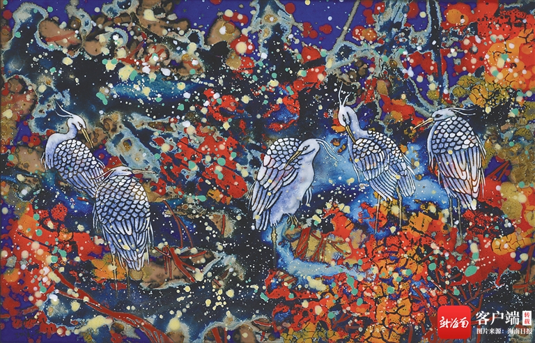 在人潮擁擠的展廳里,記者注意到一位非常具有文人氣質(zhì)的藝術(shù)家。他是南昌航空大學(xué)藝術(shù)與設(shè)計學(xué)院院長吳天麟,他的作品《十里風(fēng)荷》采用工寫結(jié)合的方式,展現(xiàn)了靈動白鷺、細(xì)致荷花和寫意蘆葦,當(dāng)代風(fēng)格明顯,甚至有些小清新。