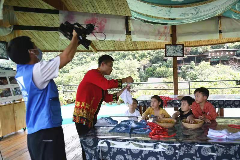 在扎染體驗區,孩子們在師傅的指導下,學習苗族“扎染”工藝。構圖、扎染、漂洗……小朋友們一絲不茍地按照指導要求完成,同時還要把自己的“扎染”作品賣給游客,這對孩子們是不小的挑戰。
