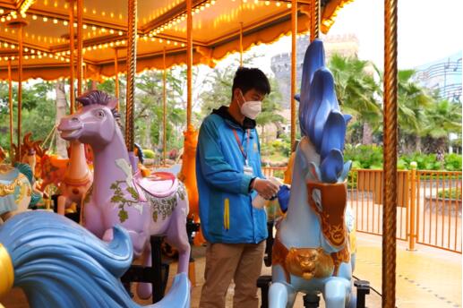 園區(qū)內的游樂設施每天至少消毒兩次以上,售票窗口、檢票口服務人員、保潔員、設備操作員等近距離服務游客的一線員工均佩戴口罩,注重個人衛(wèi)生和有效防護措施。做好工作人員自身健康保障工作,確保游客的出行安全。