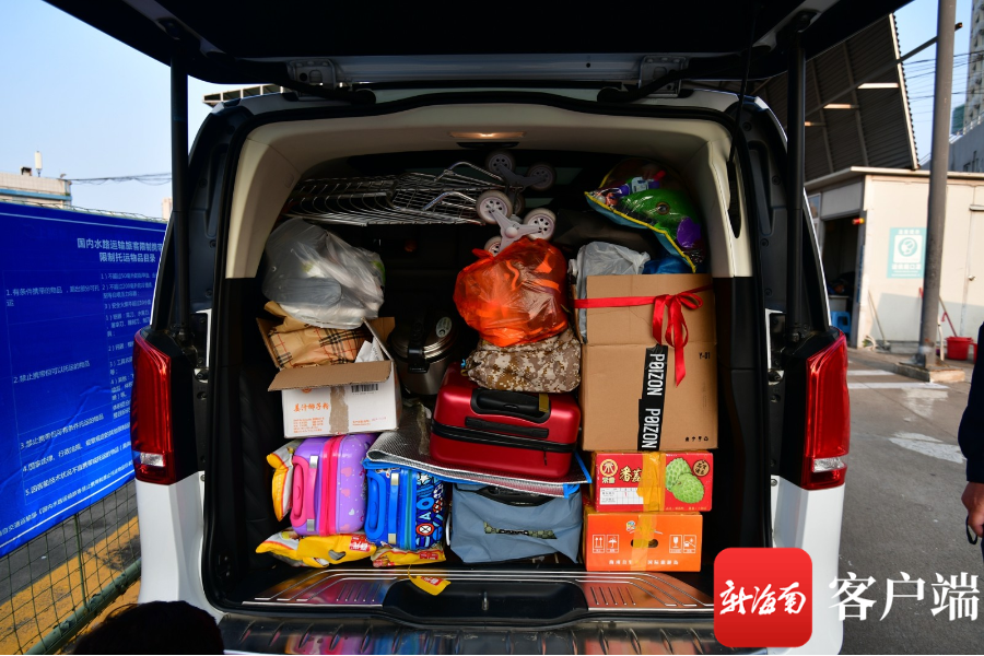 17日,在海口秀英港,返程旅客的后備箱,打開滿滿都是愛。記者 陳衛(wèi)東攝