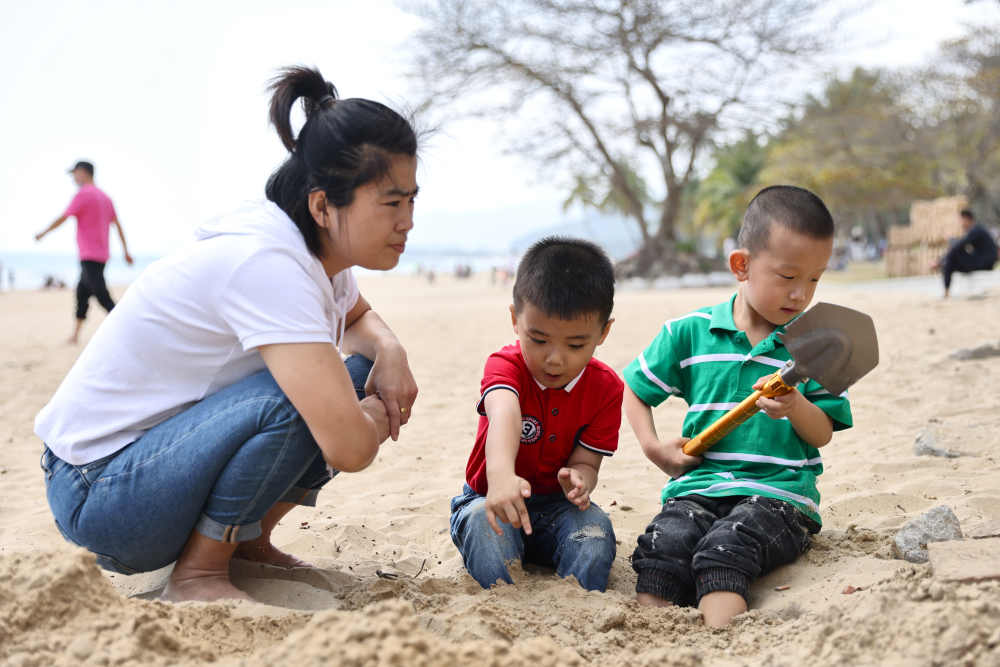 ↑2月21日,游客在海南萬(wàn)寧石梅灣的沙灘上游玩。