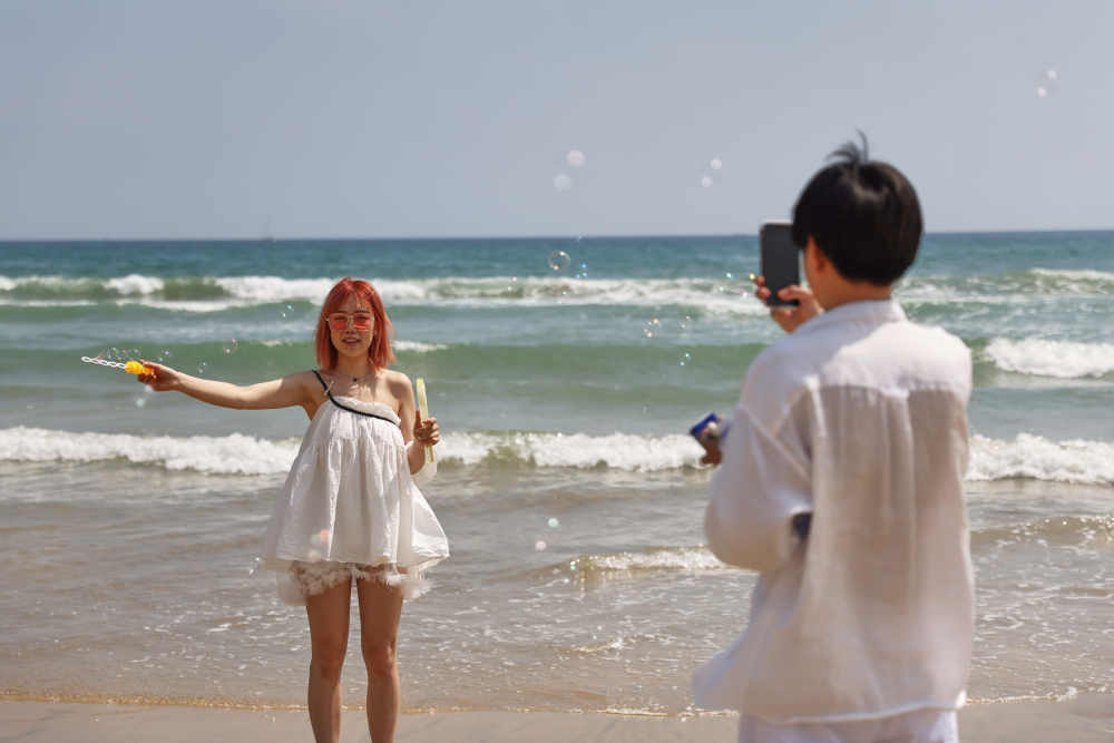 ↑2月21日,游客在海南萬(wàn)寧石梅灣拍照留念。