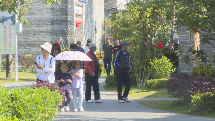 在網紅打卡點“袁家村?沙美印象”,游客們或徜徉在村里本地特色民居和騎樓風格的建筑群中,或漫步欣賞小河流水潺潺、成片綠草茵茵,快樂地蕩秋千、買特產,享受美好春光。