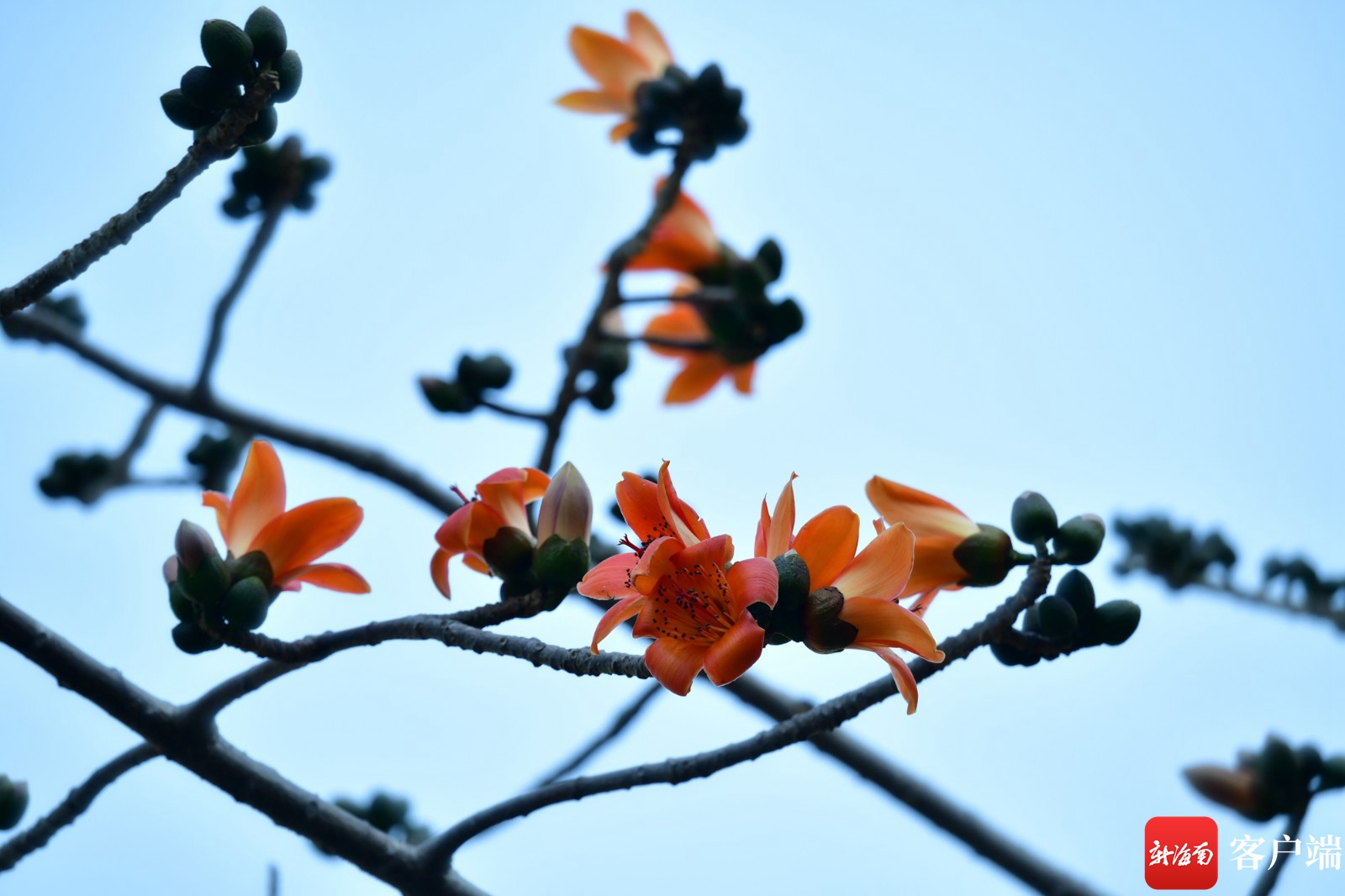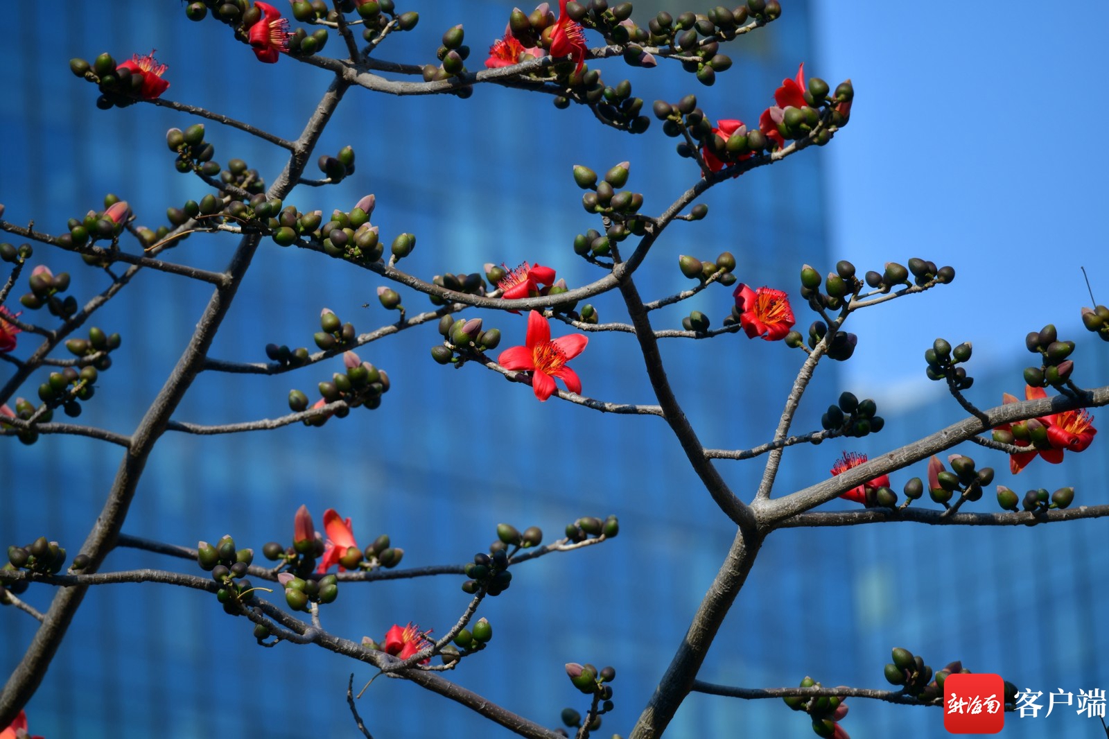 新海南客戶端、南海網、南國都市報2月26日消息(記者 陳衛東)2月25日,記者在??谑形逯干侥下房吹?,幾株木棉花已經悄然開放,由于樹種不同,大多數木棉花還是含苞待放。這些搶著開的木棉花像報春的使者,告訴大家春天來了。
