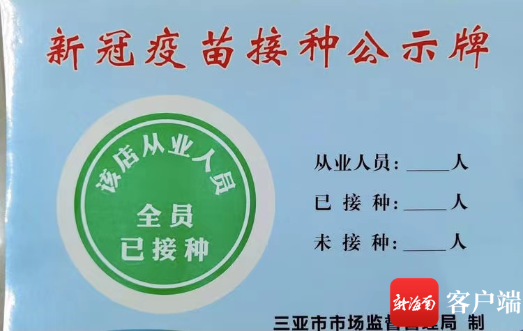 三亞市市場監督管理局全面啟動了重點行業經營單位新冠疫苗接種公示工作,通過發放“新冠疫苗接種公示牌”及“紅黃綠”圖標,對旅游購物店、海鮮廣場、餐飲店、食品銷售店、冷鏈食品加工及銷售業等重點行業疫苗接種情況進行公示管理。市民游客及時了解各經營單位的疫苗接種情況,安心進入各消費場所。