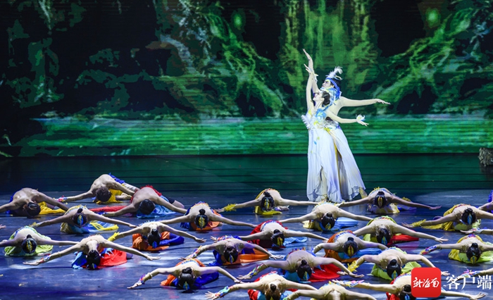當(dāng)晚,演出在一段絢麗多姿的舞蹈《姹紫嫣紅·海之南》中拉開(kāi)帷幕。隨后,《萬(wàn)物生》《漁獵嬉》《萬(wàn)鹿奔騰·鹿回頭》《迎新娘》等節(jié)目相繼上演。深情婉轉(zhuǎn)的歌聲、韻味十足的舞蹈、風(fēng)格獨(dú)特的器樂(lè)、古樸繽紛的服飾,令人目不暇接、嘆為觀止。原創(chuàng)舞劇《天堂鳥(niǎo)》選段《百鳥(niǎo)和鳴》引發(fā)觀眾強(qiáng)烈共鳴,臺(tái)上臺(tái)下交融與共,將整臺(tái)晚會(huì)推向高潮。最后,演出在《永遠(yuǎn)的邀請(qǐng)》深情優(yōu)美的歌聲中緩緩落下帷幕,全場(chǎng)經(jīng)久不息的掌聲,代表著新時(shí)代的海南、屹立潮頭的??跓崆闅g迎來(lái)自五洲四海的賓朋。