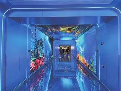 該“時(shí)光隧道”位于三亞鳳凰國際機(jī)場(chǎng)T1航站樓通往機(jī)場(chǎng)免稅店的西擴(kuò)連廊處,整體設(shè)計(jì)分為前、中、后三部分,通道前后端配合6種不同的燈光顏色來呈現(xiàn)不同的場(chǎng)景效果,中端的LED屏幕展現(xiàn)以海底世界和夢(mèng)幻星空等為主題的全方位立體環(huán)繞影像。“時(shí)光隧道”內(nèi)變幻莫測(cè)的燈光配合著LED屏幕中生動(dòng)、逼真的主題動(dòng)畫,使光與影的交替變幻延伸至整個(gè)隧道空間,透露著壯闊、靜謐之感,將自然風(fēng)光與現(xiàn)代科技感完美融合,讓旅客直觀且強(qiáng)烈感受到撲面而來的熱帶海洋氣息,領(lǐng)略旖旎的鹿城海島風(fēng)光。