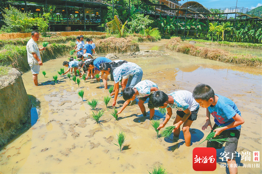 在檳榔谷的研學(xué)活動(dòng)中,孩子們體驗(yàn)插秧。(景區(qū)供圖)