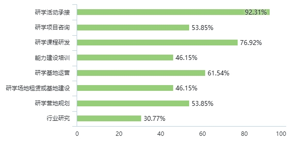 1、基本情況:絕大多數的研學機構擁有接待研學團體活動的能力和經驗,研學服務體系相對完善。其中76.92%的機構自主開發(fā)研學課程,61.54%的機構有基地運營能力。