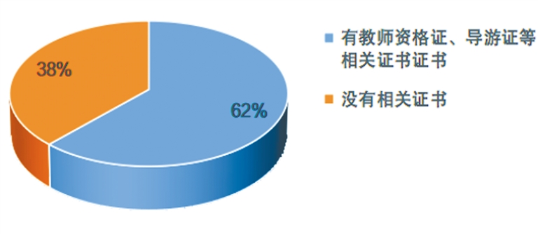 3.相關資質:基地、機構內的研學導師從業(yè)資質情況較好,但是仍有1/3左右的沒有任何資格證。