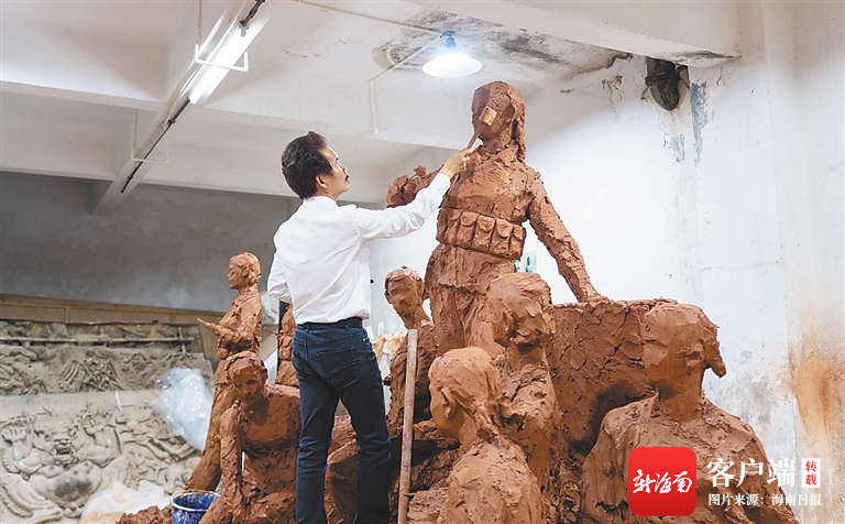 許鴻飛在雕塑創作《西島女民兵》。