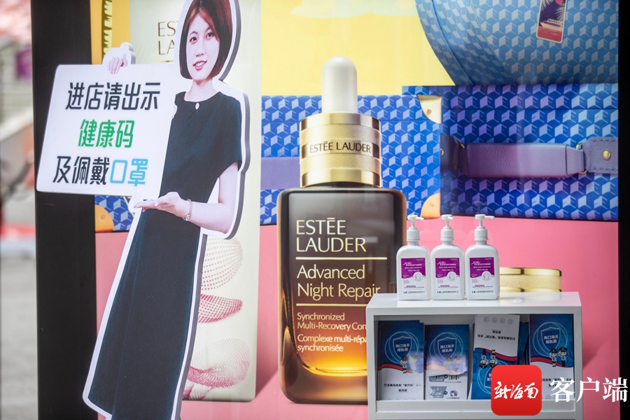 免稅店要求全店工作人員每日定時(shí)體溫檢測(cè)并實(shí)施健康監(jiān)測(cè),工作期間佩戴口罩和手套,門(mén)店定時(shí)對(duì)整個(gè)公共區(qū)域進(jìn)行全面消毒,此外,店內(nèi)專柜設(shè)置了一米欄保證顧客合理間隔有序地排隊(duì)購(gòu)物,店內(nèi)所有收銀臺(tái)和服務(wù)臺(tái)都放置免洗消毒洗手液供客人使用。