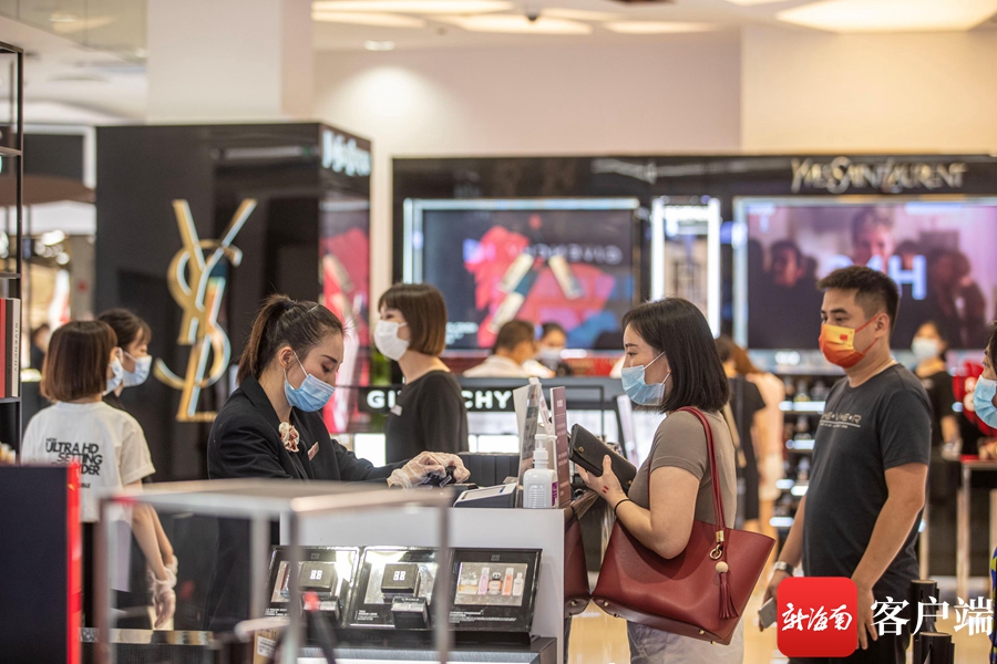 免稅店內(nèi)市民游客佩戴口罩有序購(gòu)物。記者 劉洋攝