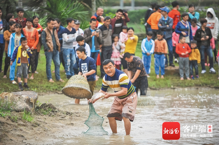 文昌市潭牛鎮(zhèn)大廟村,游客在體驗(yàn)捕魚。海南日?qǐng)?bào)記者 袁琛 攝