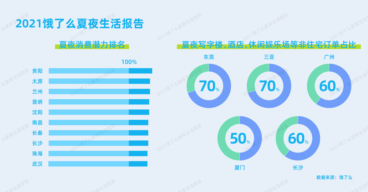 同時,三亞的夜生活場景也相當(dāng)多元。數(shù)據(jù)顯示,除了宅家之外,三亞餓了么夜間訂單中近七成來自商場、酒店等多類場景,占比僅次于東莞。其中,來自酒店、度假區(qū)內(nèi)的游客外賣訂單占比近四成,明顯超過了住宅區(qū),也反映出了三亞旅游業(yè)的興旺。