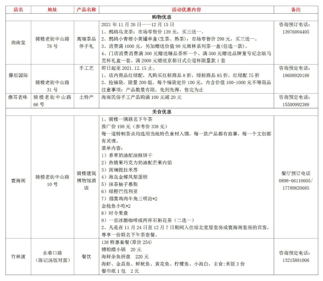 騎樓老街美食融匯瓊、閩、粵烹藝,引進東南亞風味,形成了豐富多彩的味覺體驗。“七分食材三分功,味道誠可貴,健康價更高”的瓊菜白切世家、剛榮獲第六屆中國國際飯店業大會評定并頒發2021年度“美食打卡新地標”的全豐泰文化餐廳;傳統+創新烹出海南獨特風味的皇隆閣海南私房菜......美食每刻的吃貨們,酣暢淋漓的感受食材的原汁原味!歡樂節期間,騎樓老街也將聯合各商家推出各項優惠。