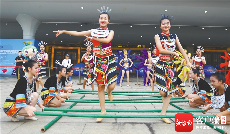 參加2020年海南國際旅游島歡樂節的女孩在歡跳竹竿舞。高林 攝
