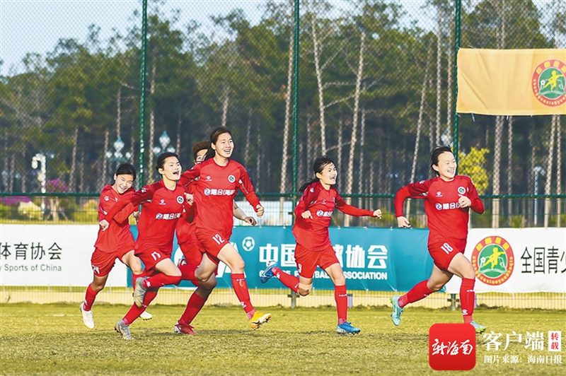 2021年中國足球協會女子乙級聯賽暨全國青少年校園足球大學生女足聯賽半決賽中,海南瓊中女足贏球后奔跑慶祝。賽事組委會供圖